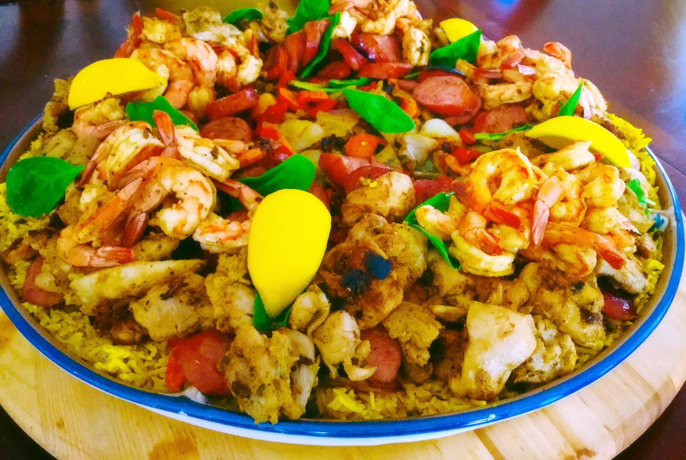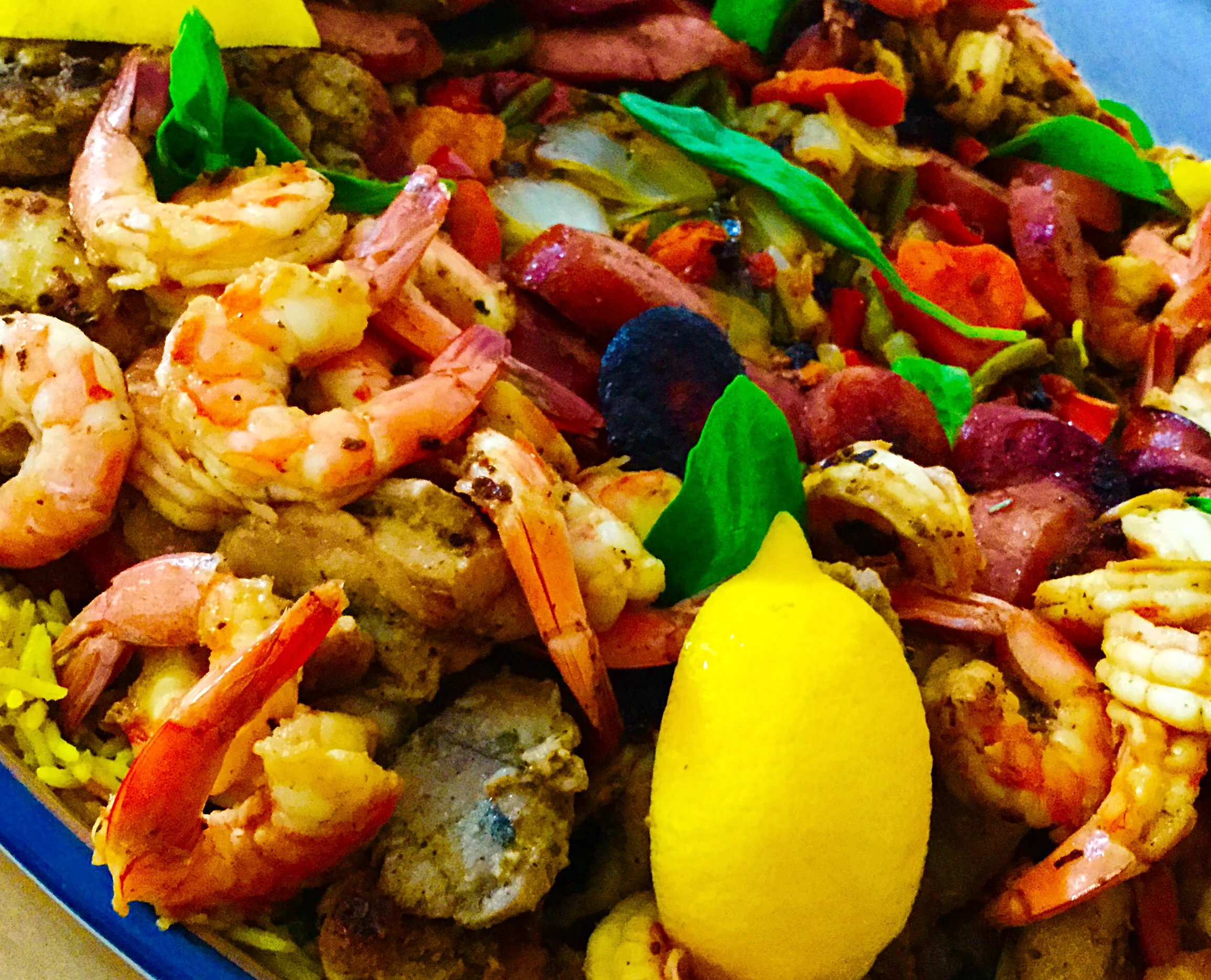 My first time, I enjoyed so very much preparing this meal - essentially a Spanish dish of rice, saffron, chicken, seafood, etc., cooked and served in a large shallow pan.  This I did for Grannie's b-day - 73!  It's a dish that pleases all - to see and to feast - and can be something different and still special each time you prepare it.  The key, for me, is to put into it the meats and the veggies that you like.  Do you see all that feasting fun & flavor!  Truly, it's gotta be a meal in paradise!