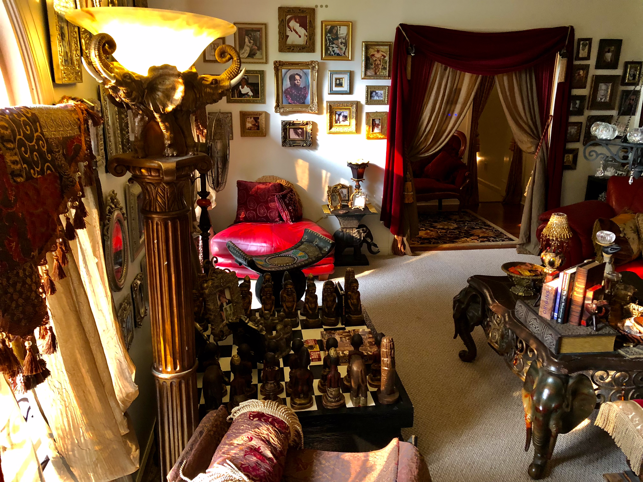 Standard size guest room, features queen-size antique-iron bed (sleeps 2), boudoir-ish, highlighting images of our “Queendom” with soft, pillowy accents of Teal & Peacock Blues & Karats of Gold & Copper. NOTE shared full & half baths. Specialty Gift Basket recommended!