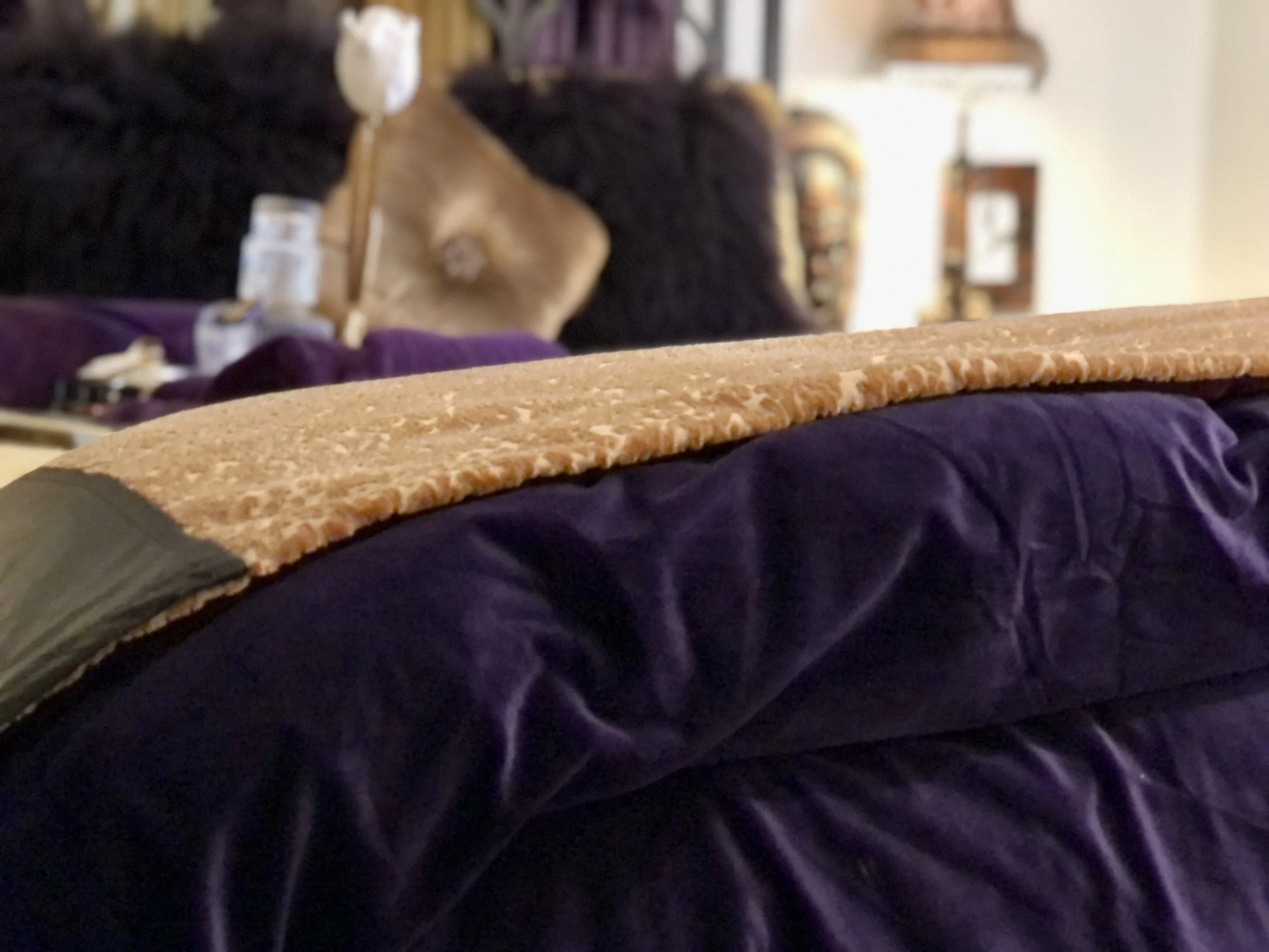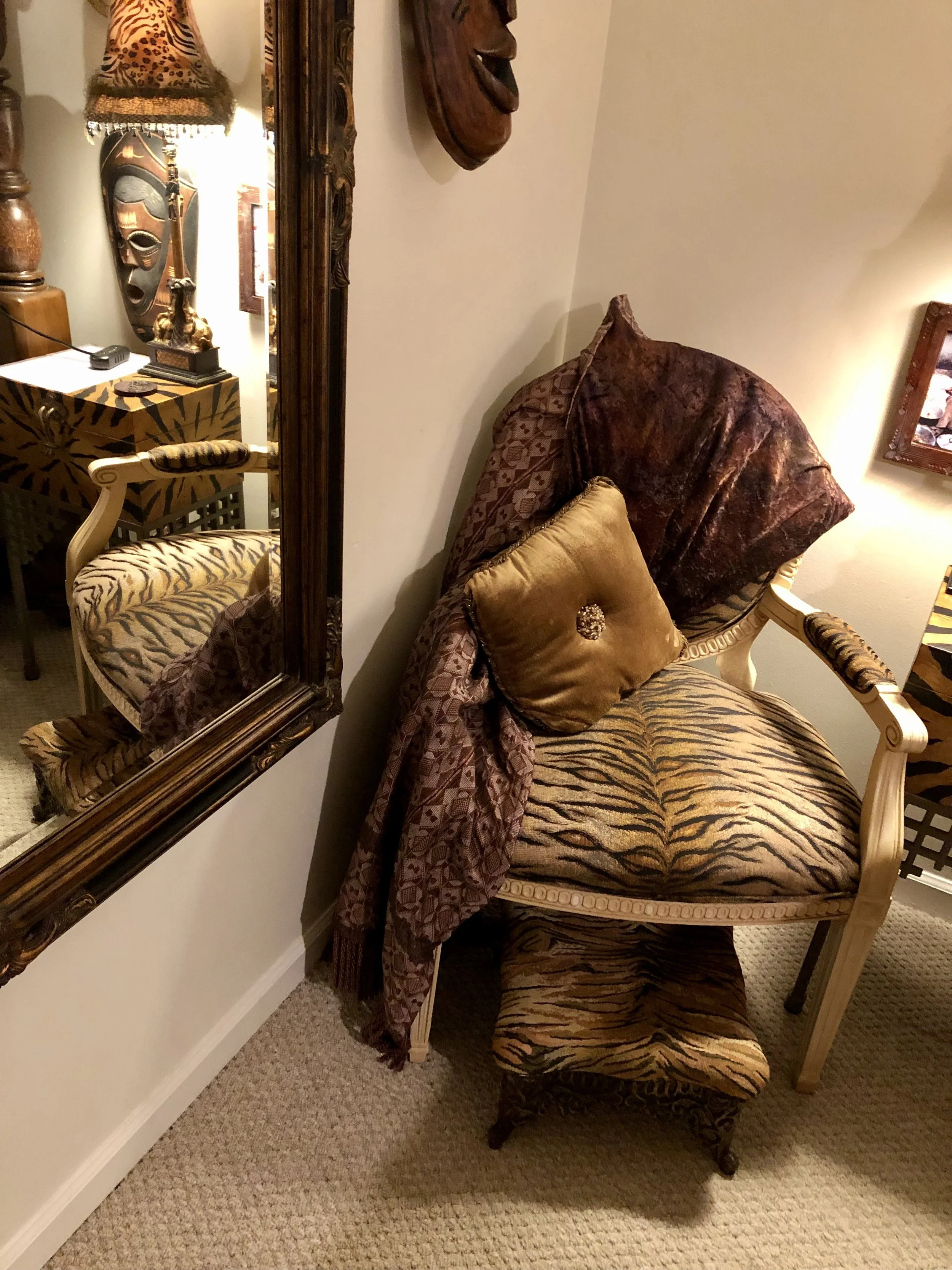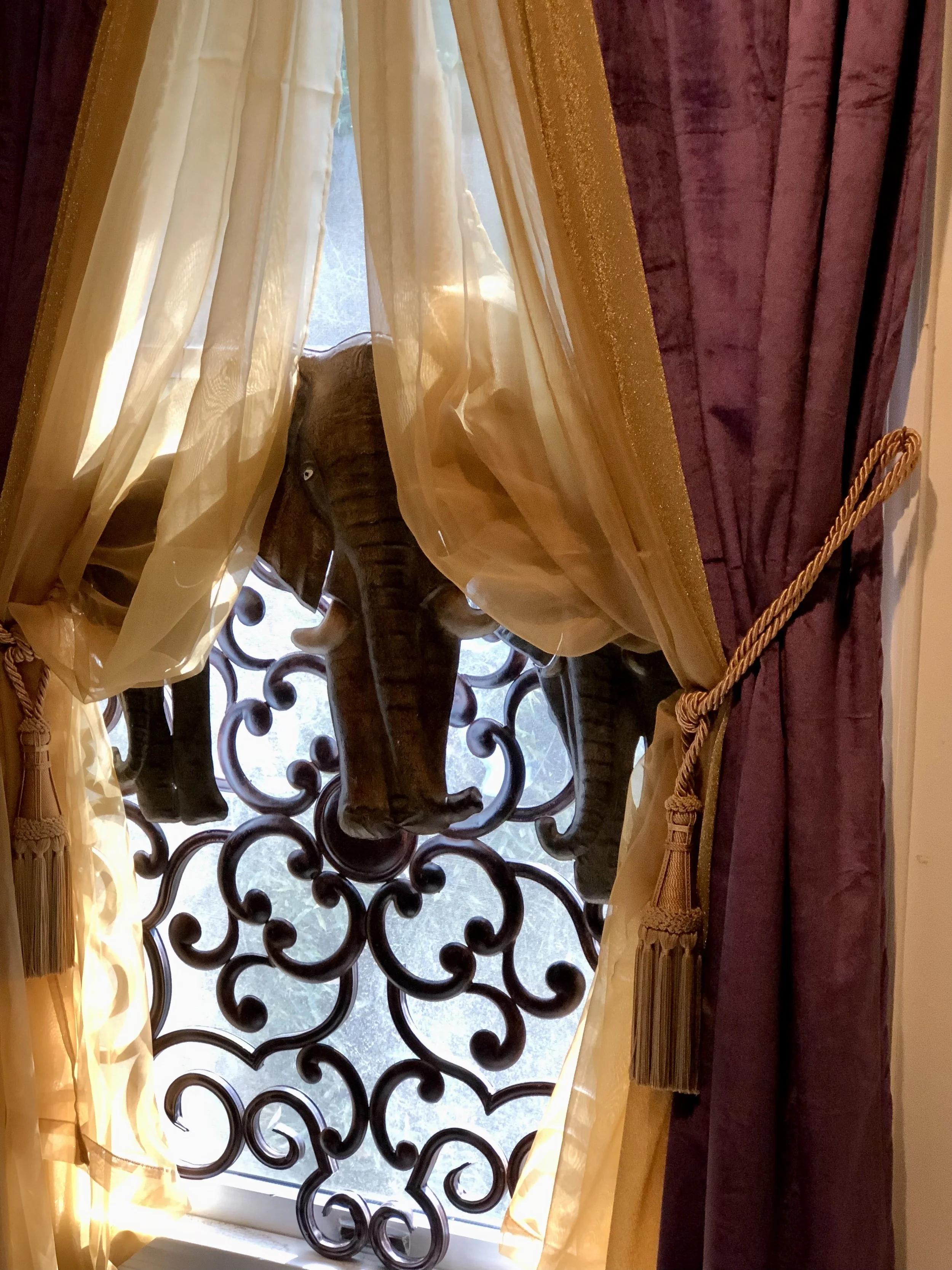 SANATA’S ROOM—Standard size room, features queen-size hand-carved 4-poster-bed (sleeps 2) wrapped in shades of Indigo, Blue Violet & Merigold, showcasing our African pride & customs in textures, patterns & prints. NOTE: Shared full and half baths!